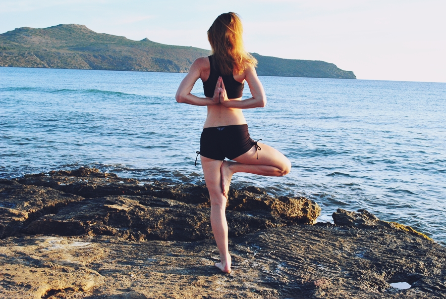 Sportowy biustonosz i krótkie spodenki to mój niezastąpiony wakacyjny strój do praktyki jogi.