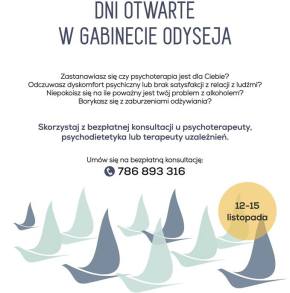 Wraz z Gabinetem Odyseja zapraszam na drugie już w tym roku DNI OTWARTE, w trakcie których będziecie mogli skorzystać z bezpłatnych porad psychologa, psychoterapeuty, coacha i psychodietetyka!